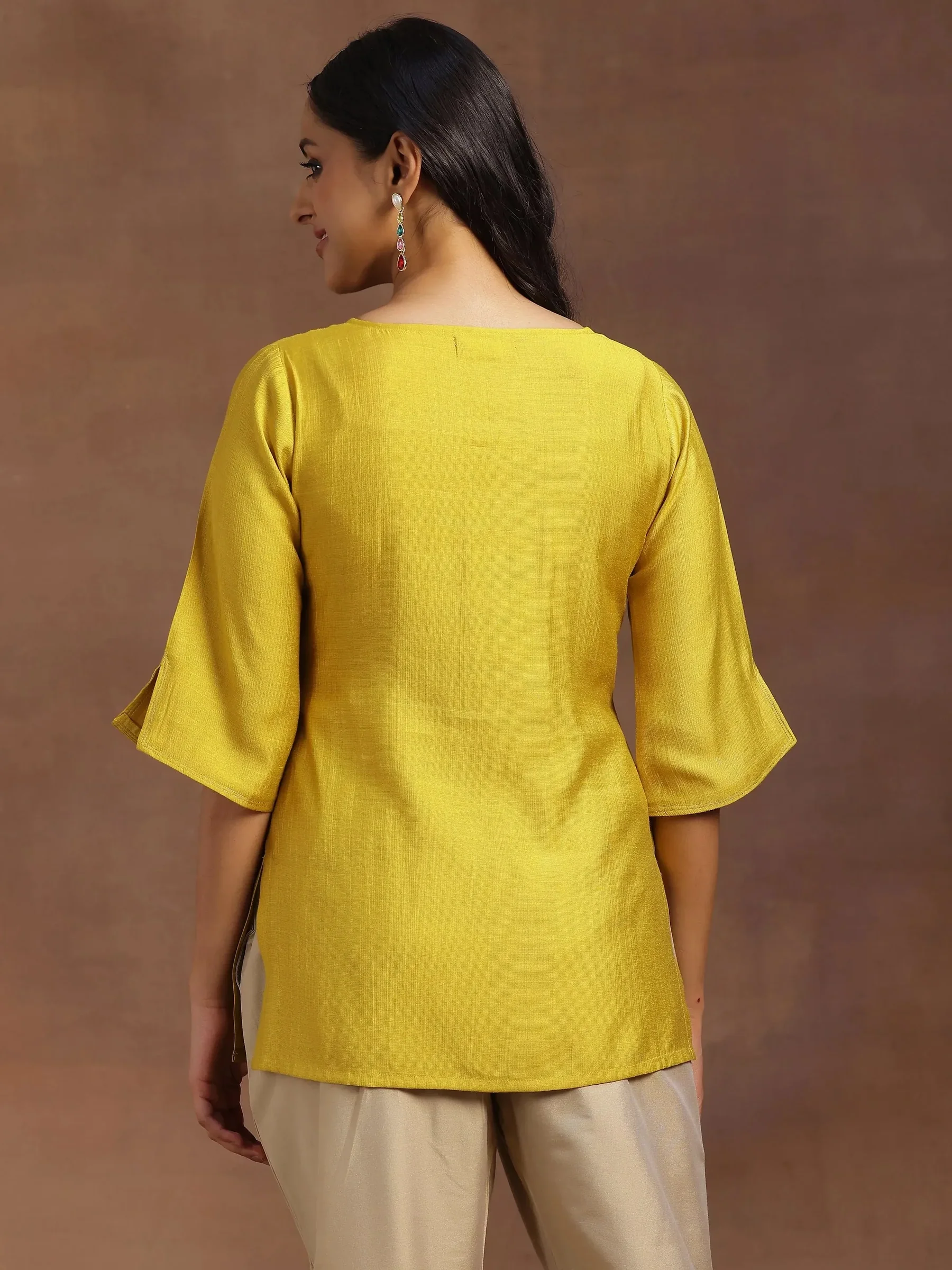 Yellow Solid Silk Blend Straight Kurti